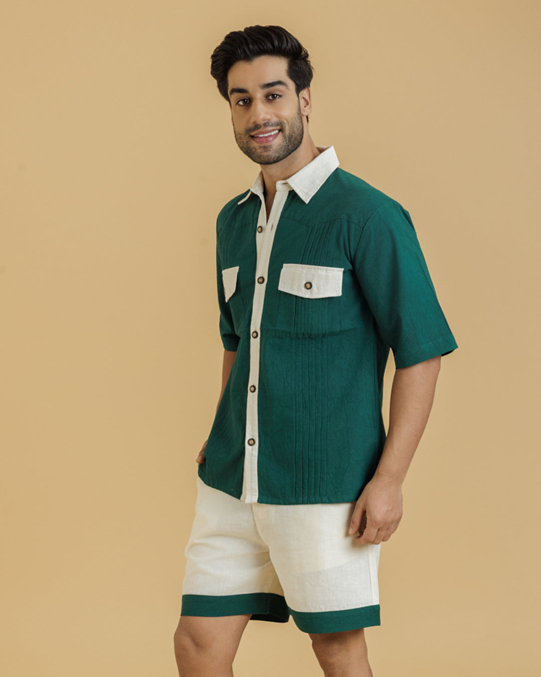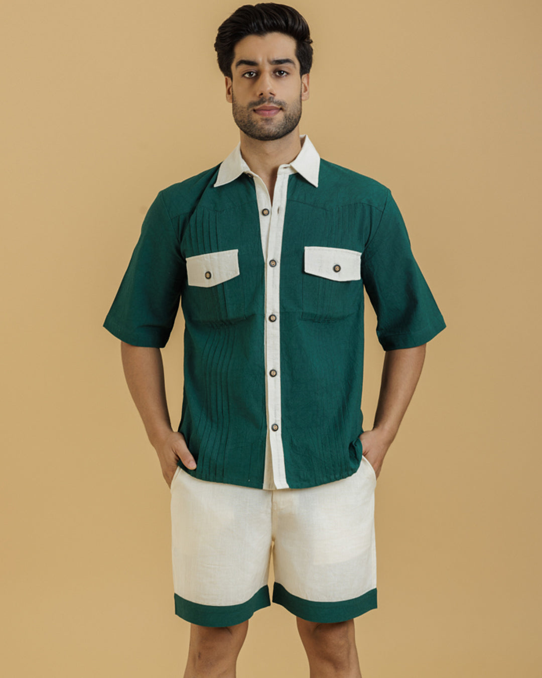 Upgrade your casual wardrobe with these Men's Beige Shorts, designed with a stylish green panel at the bottom for a pop of color. Featuring practical side pockets, these shorts blend functionality with modern design, making them a versatile choice for various occasions.