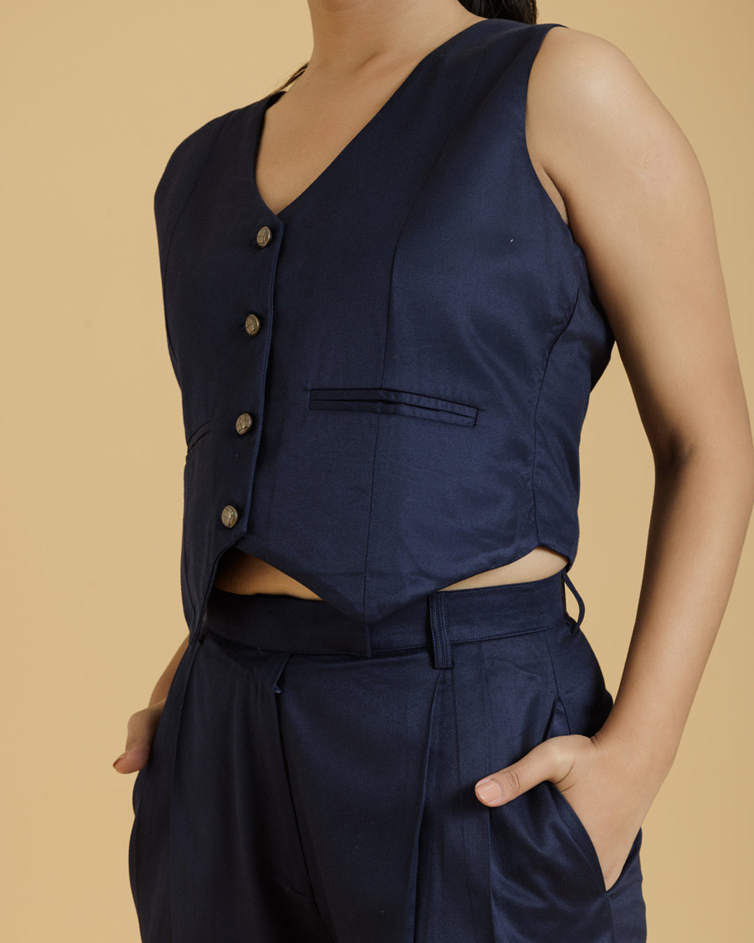 - Design: Sleeveless with a structured fit and button closure
