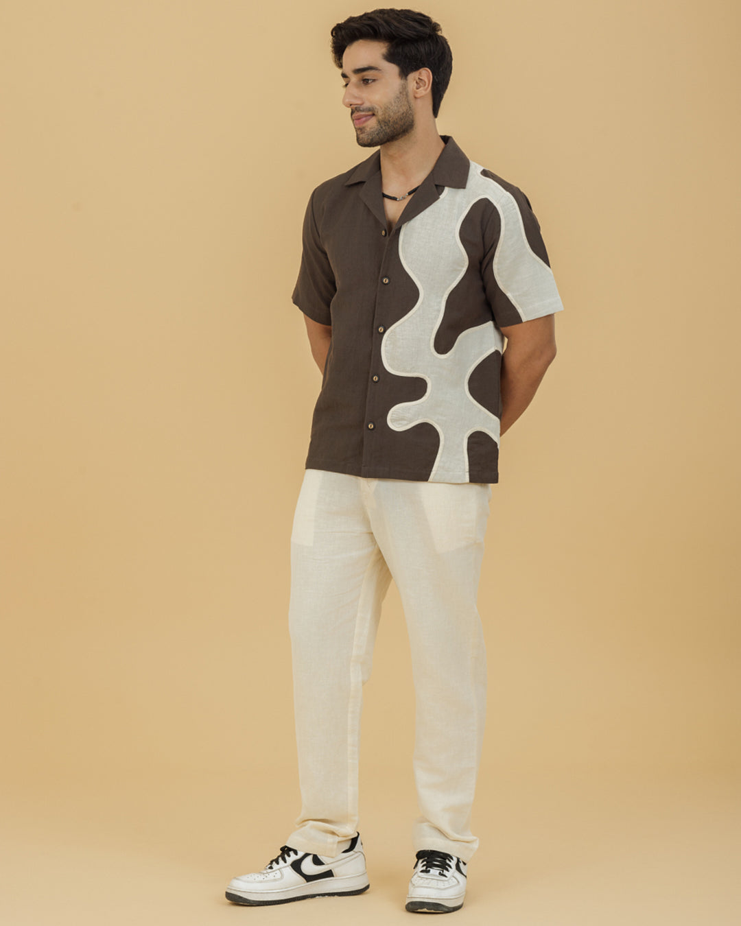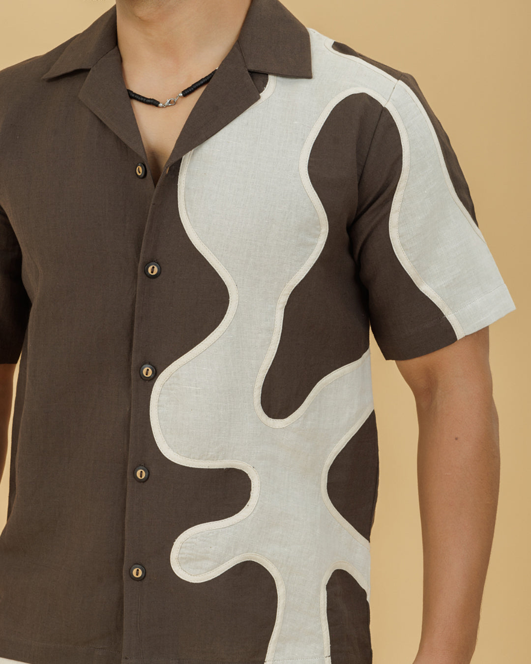 Refresh your wardrobe with the Beige and Brown Patchwork Half Sleeves Shirt. This shirt features a distinctive Cuban collar and a bold color contrast between beige and brown. The asymmetric brown patch on the beige base, combined with raw edge detailing, creates an eye-catching look that blends modern style with unique textures.