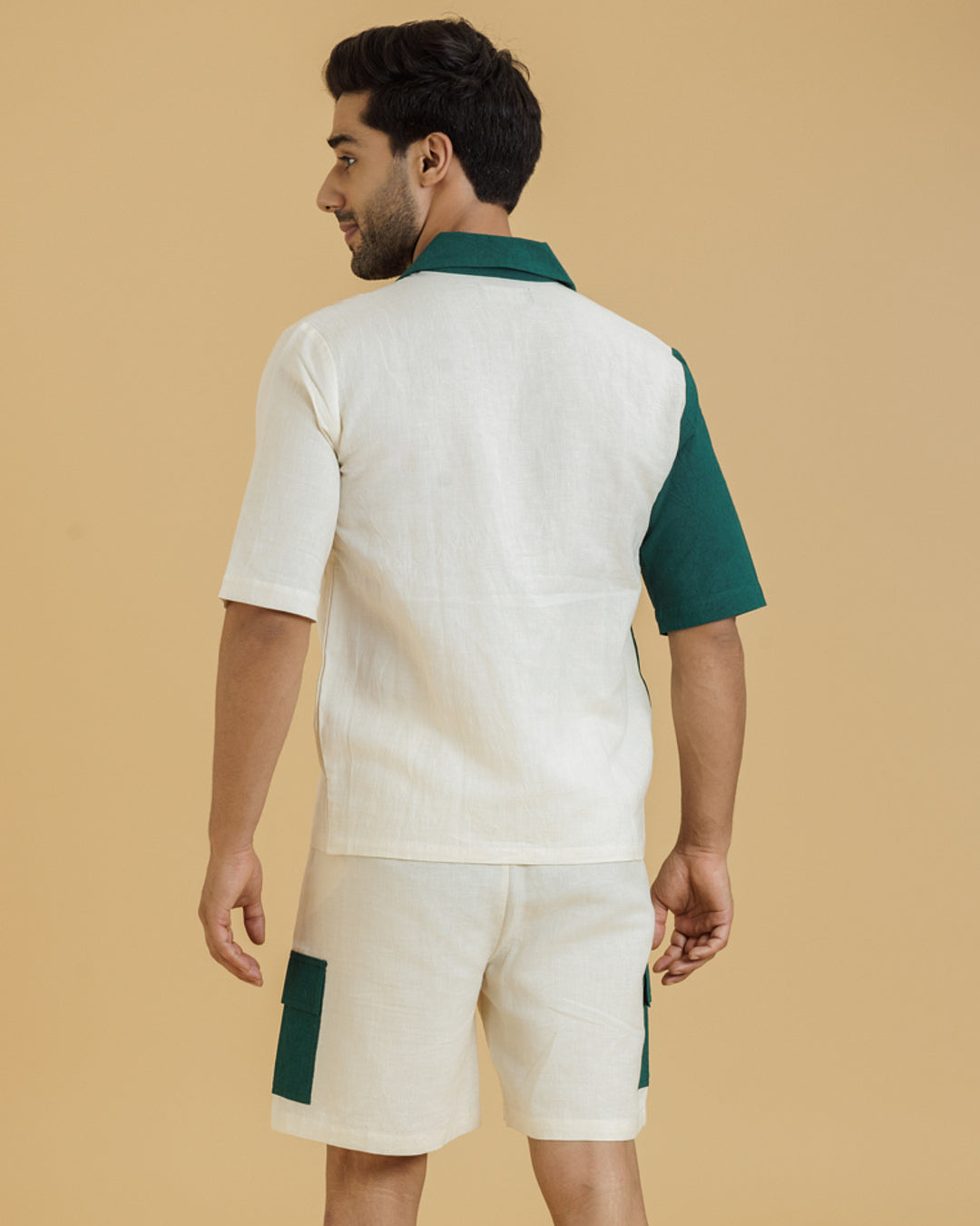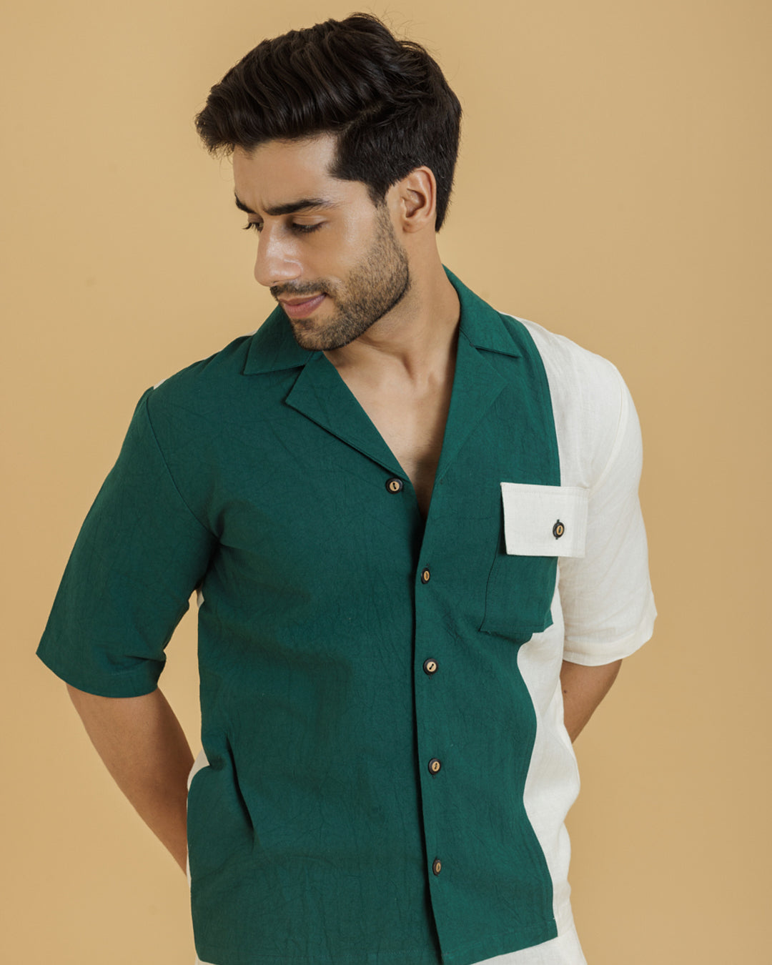 Discover the Beige and Green Patchwork Half Sleeves Shirt, a harmonious blend of color contrast and modern design. Featuring a Cuban collar and a distinctive asymmetric green patch on a beige background, this shirt adds a touch of sophistication and flair to your wardrobe. The vibrant contrast and unique details make it an eye-catching choice for both casual and semi-formal occasions.