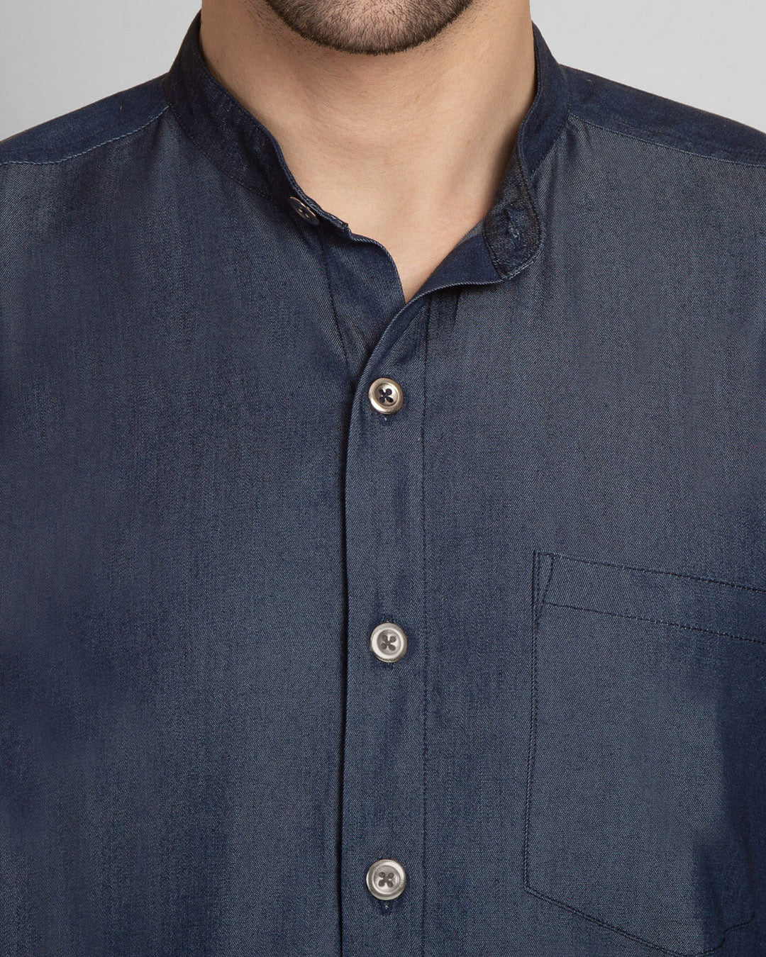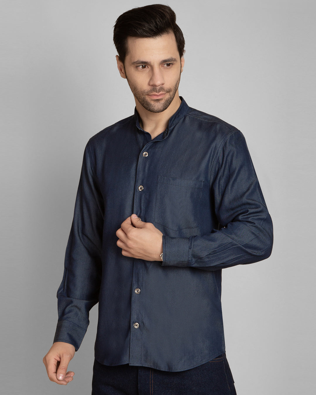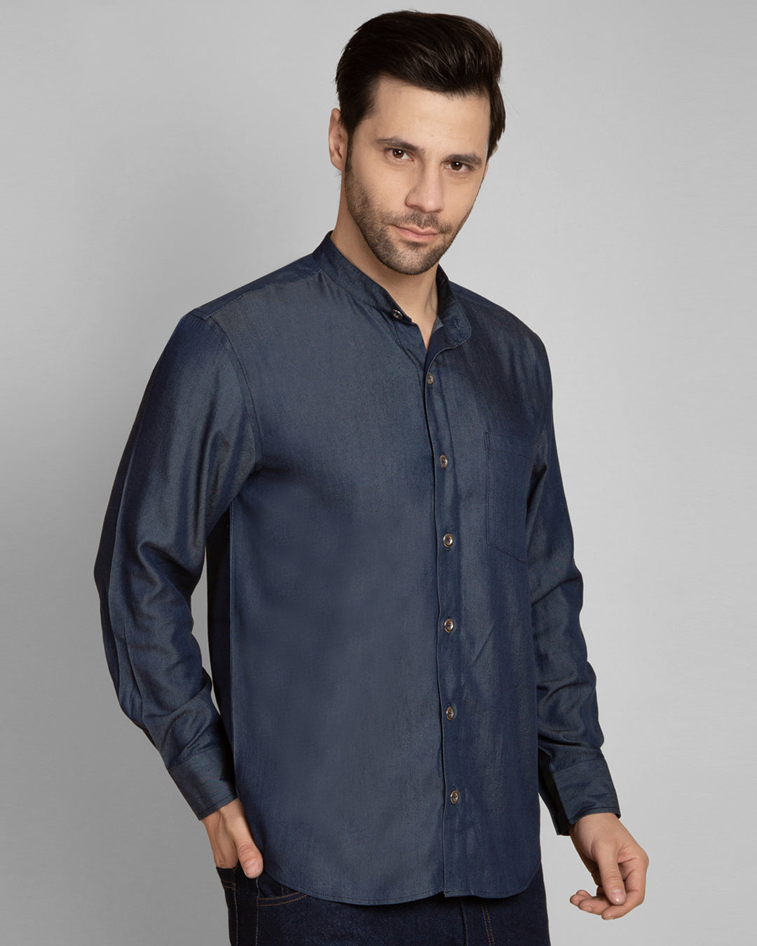 Our Classic Denim Mandarin Collar Shirt features full sleeves with cuffs and a regular fit, blending rugged charm with sophisticated style. Perfect for casual outings or formal events, it's a versatile wardrobe staple designed for effortless, modern elegance.