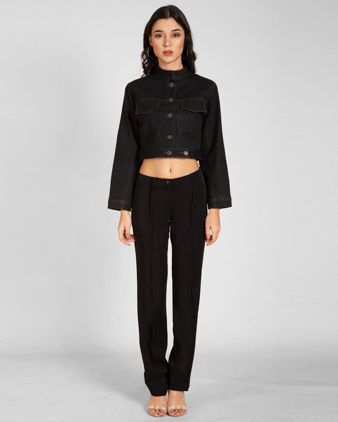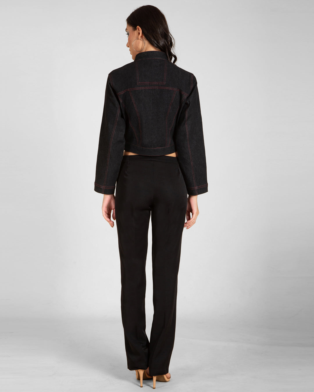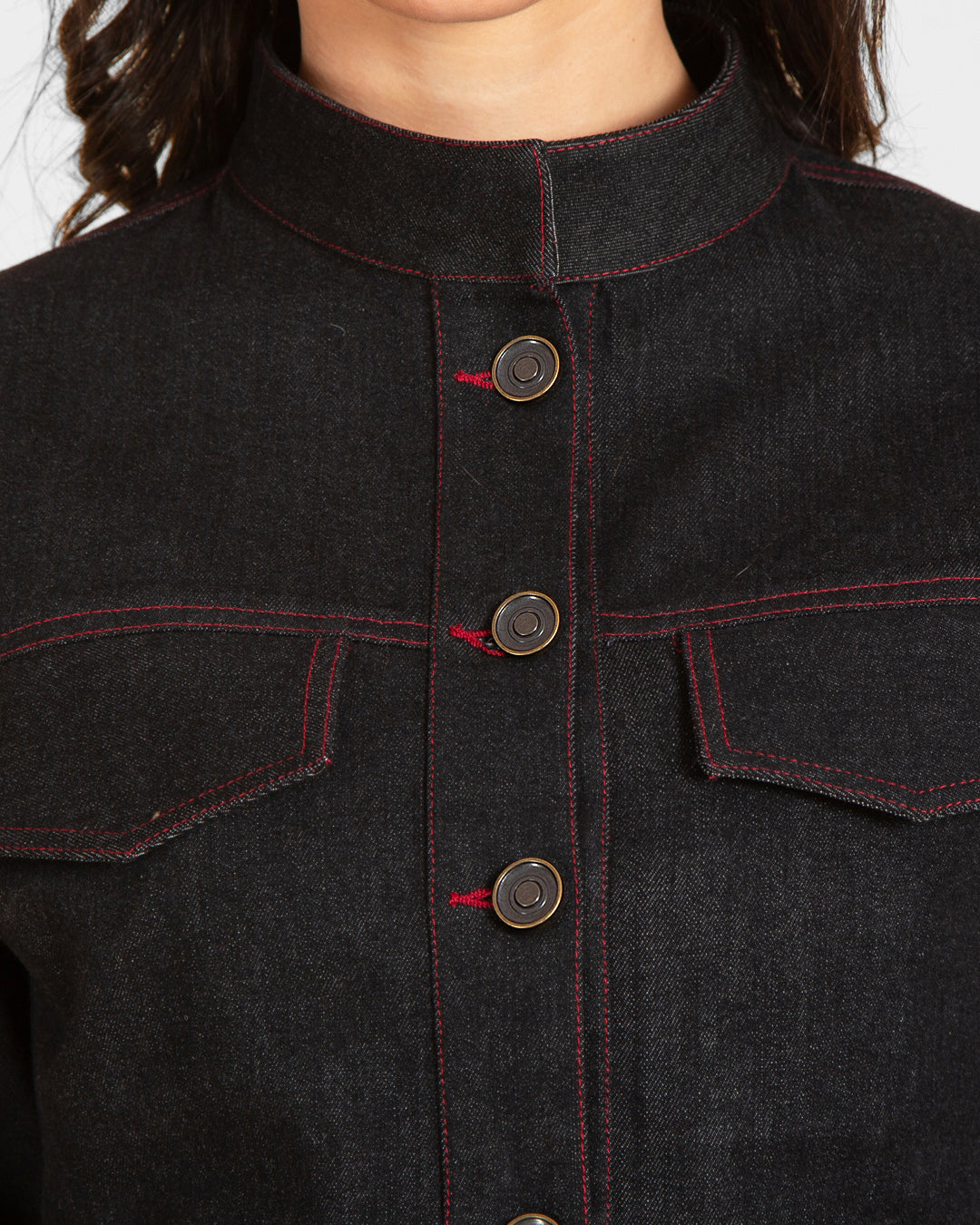 Elevate your style with this Women's Cropped Fitted Denim Jacket, designed to make a statement. Featuring a sleek fitted silhouette and front flap details on both sides, this jacket combines functionality with modern aesthetics. The full sleeves and contrasting red topstitching add a bold, edgy touch, making it a standout piece for any occasion. Perfect for layering over casual tees or pairing with high-waisted bottoms, this jacket is both versatile and chic. Whether for a night out or a daytime outing, it's the ultimate blend of style and comfort, crafted to turn heads wherever you go.