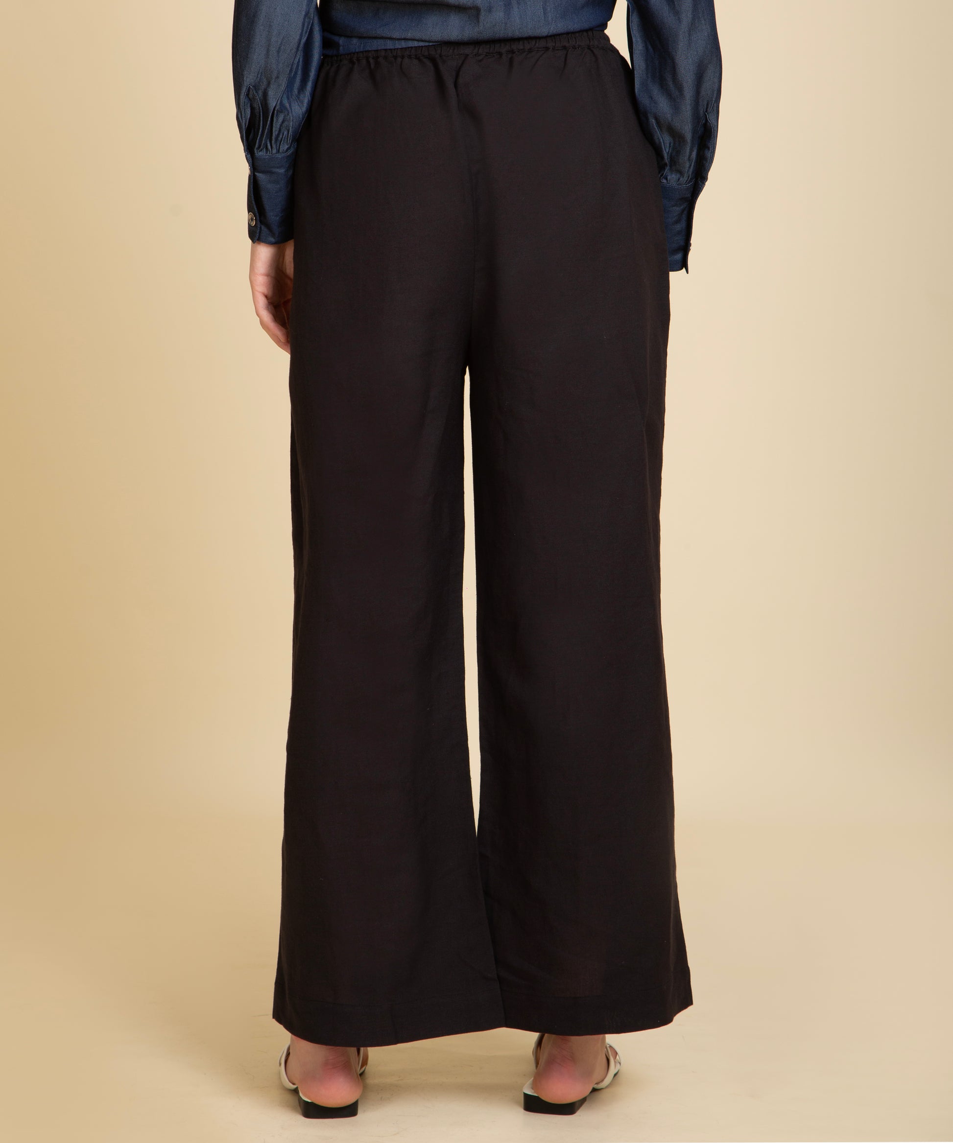 Wide-leg black trousers in a breathable hemp-cotton blend, featuring an elastic waist, side pockets, and relaxed sophistication.
