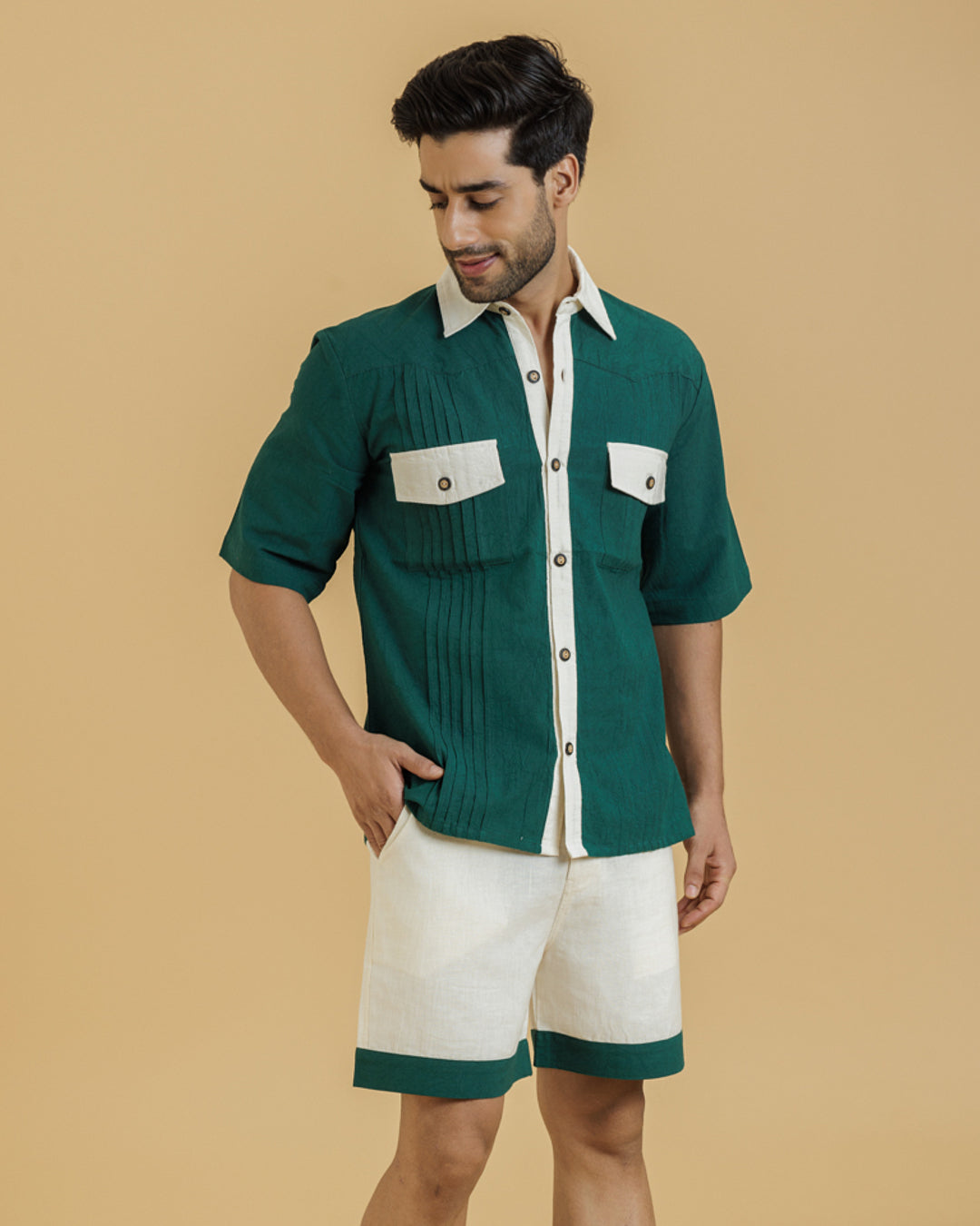 Green / Beige Men's Pintuck Shirt