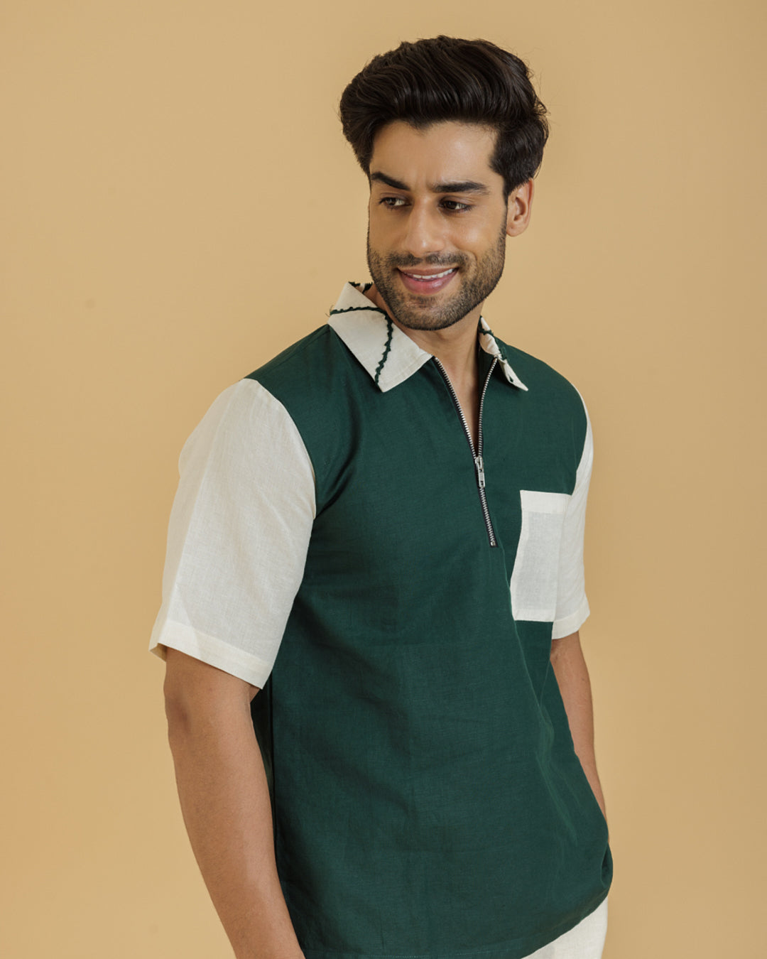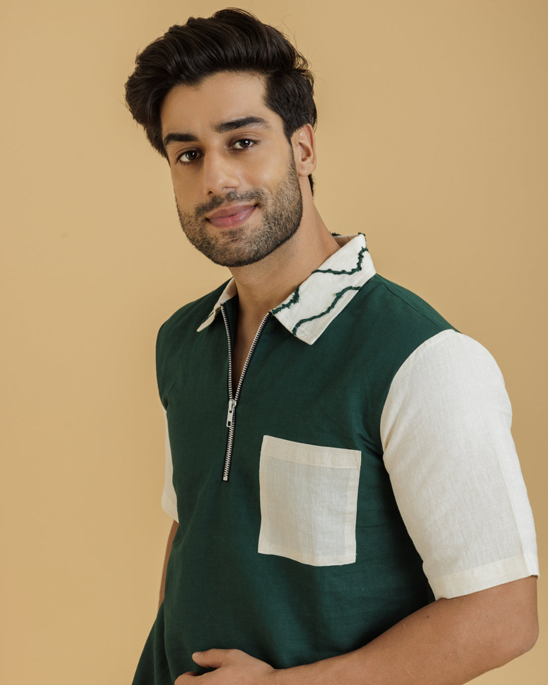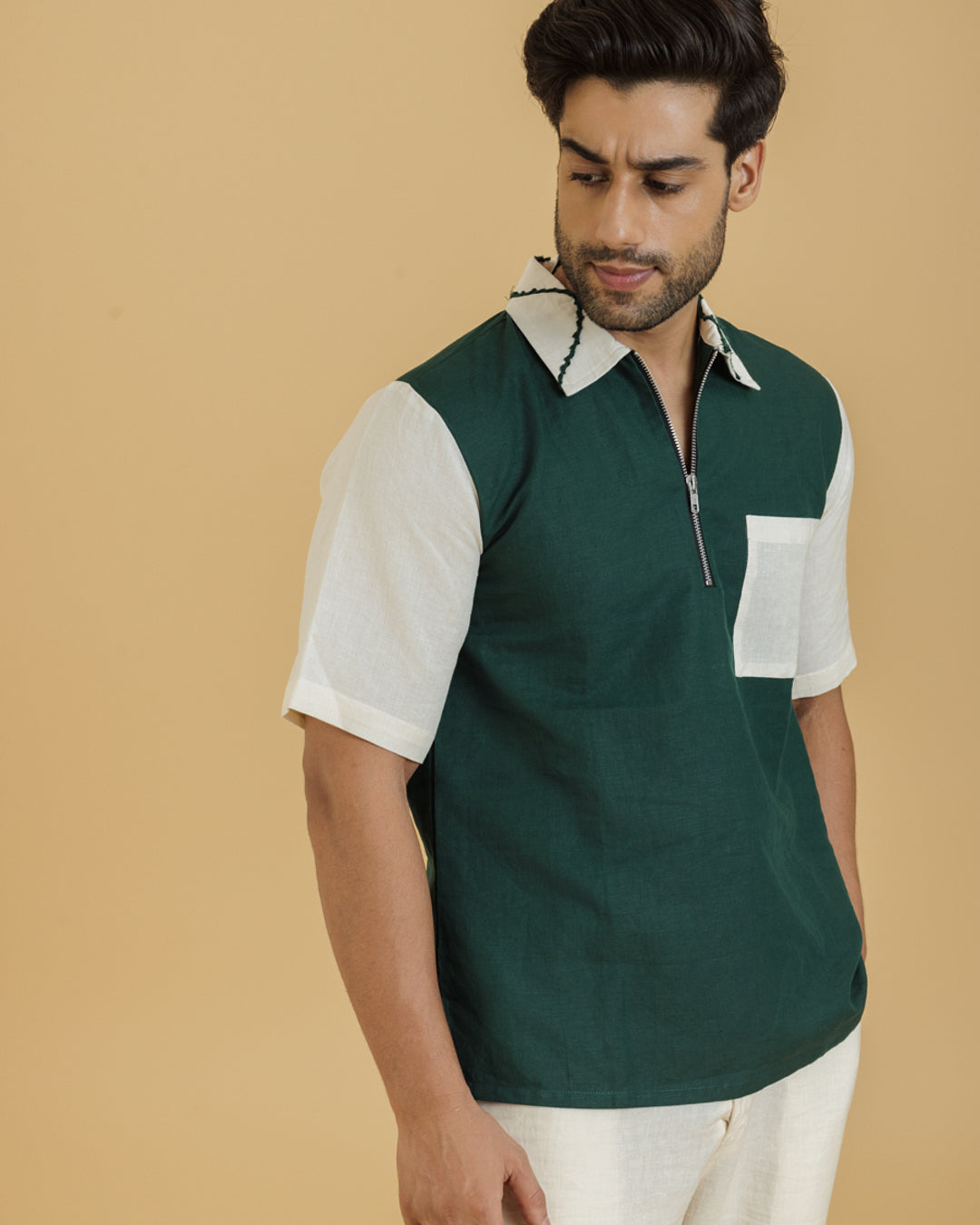 Elevate your casual wardrobe with the Beige and Green Polo Half Sleeves Men's Shirt. This shirt features a striking color contrast between beige and green, complemented by applique details on the collar for a distinctive touch. For added comfort and practicality, it includes a front zipper opening and a convenient pocket on the front.