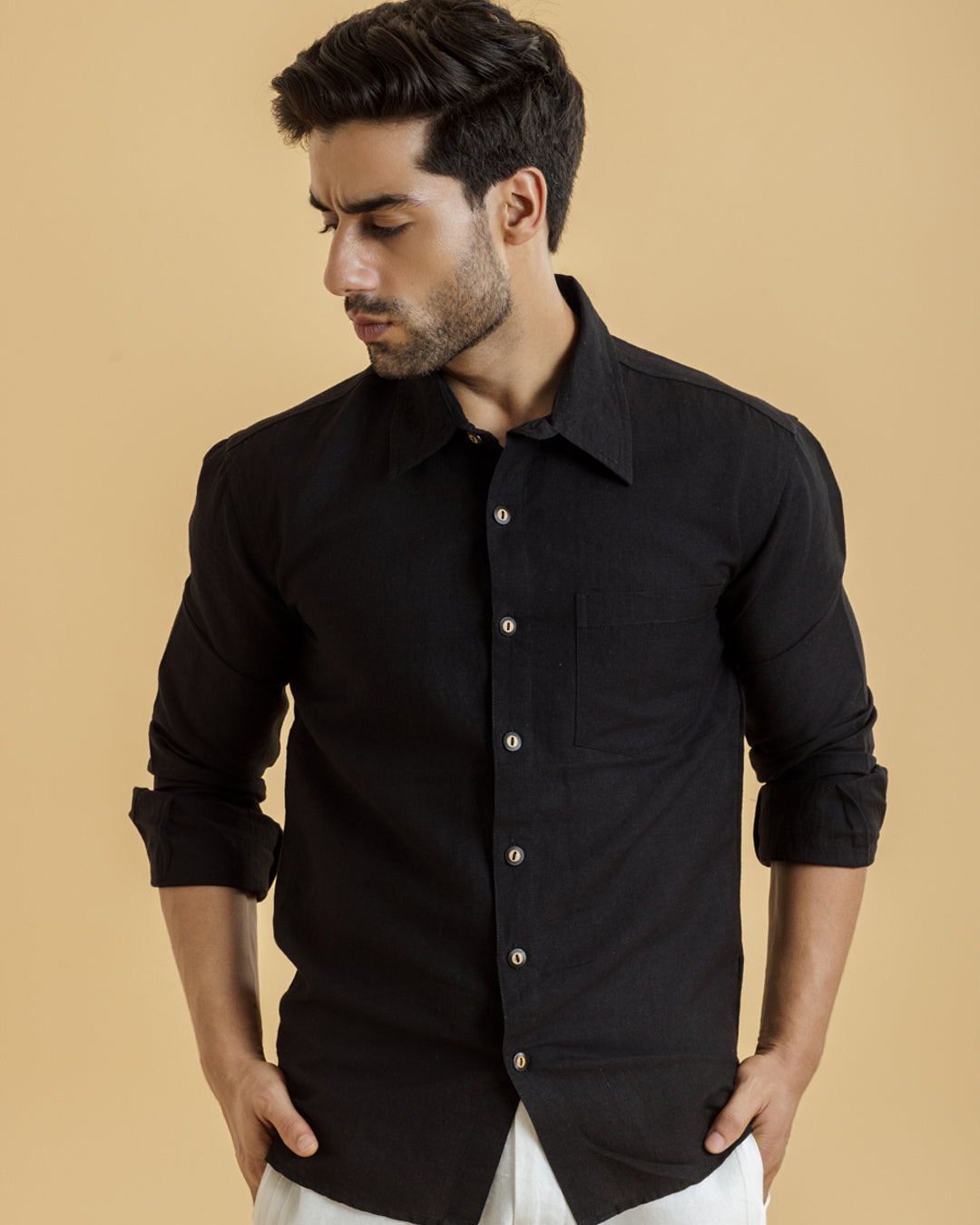 Design: Solid black with a left chest pocket and wooden button detailing