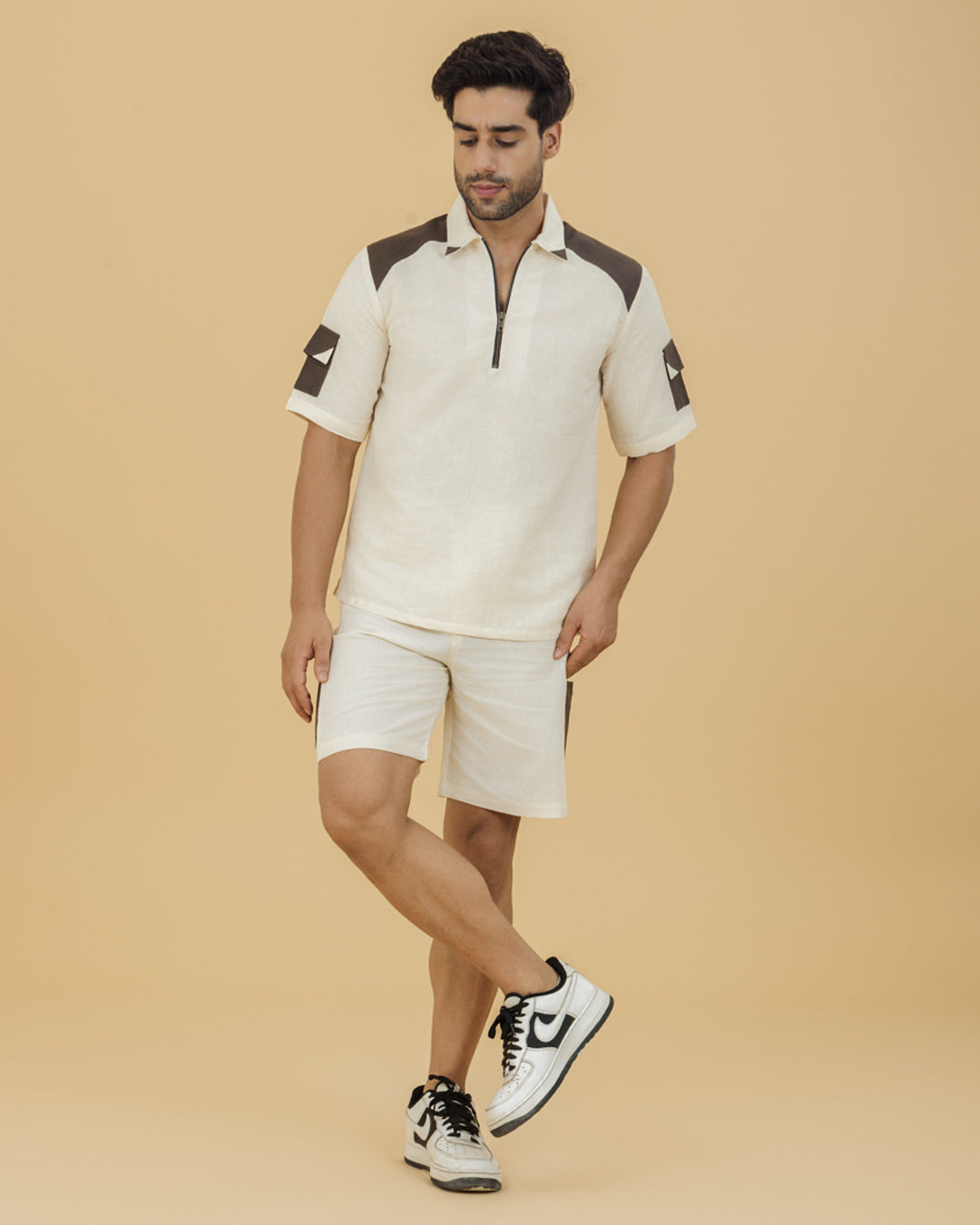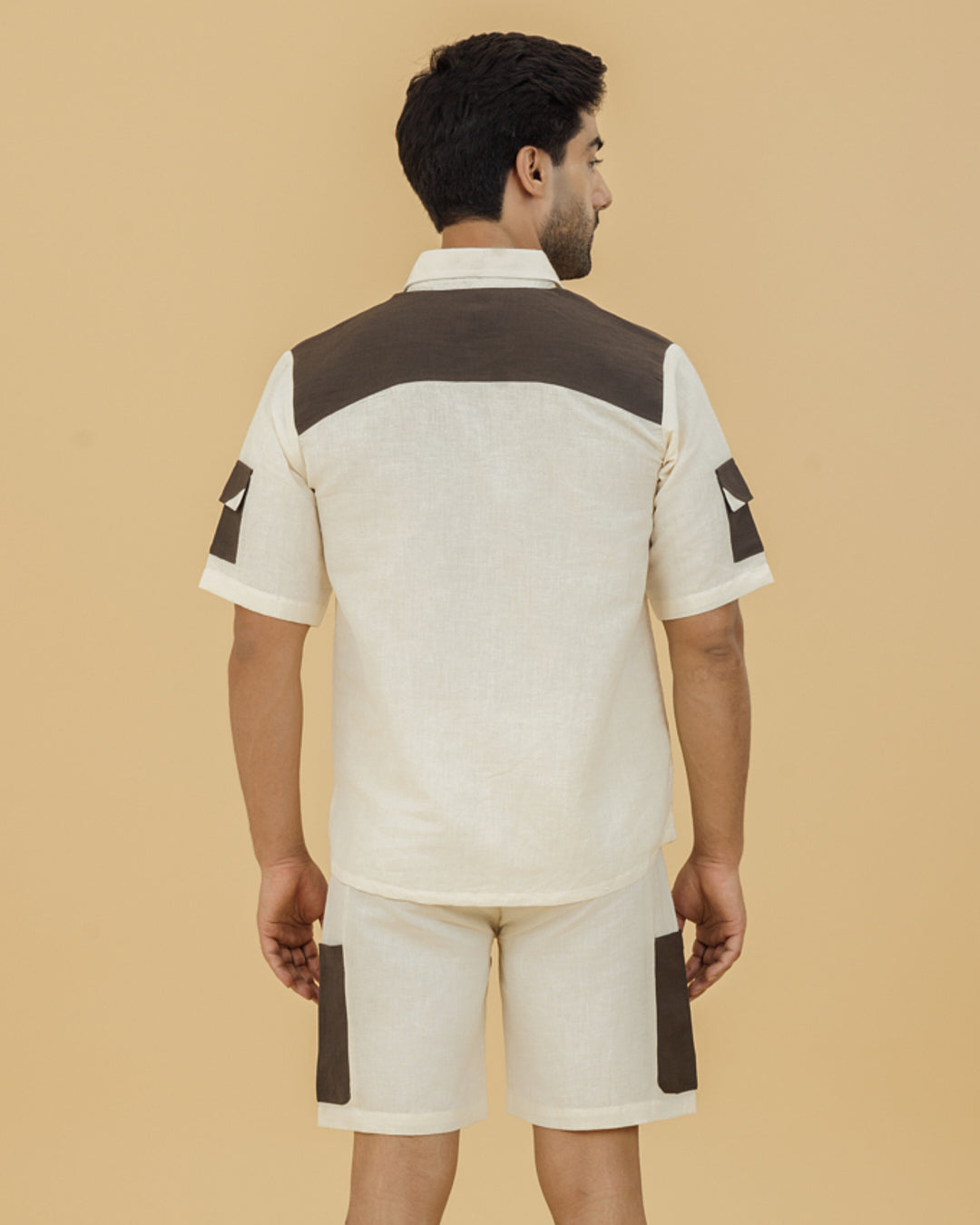 Elevate your casual style with these Men's Beige Shorts, featuring distinctive brown patch pockets on the side seams. The contrast of the brown patches against the beige fabric adds a touch of modern sophistication while maintaining practicality with the convenient pockets.