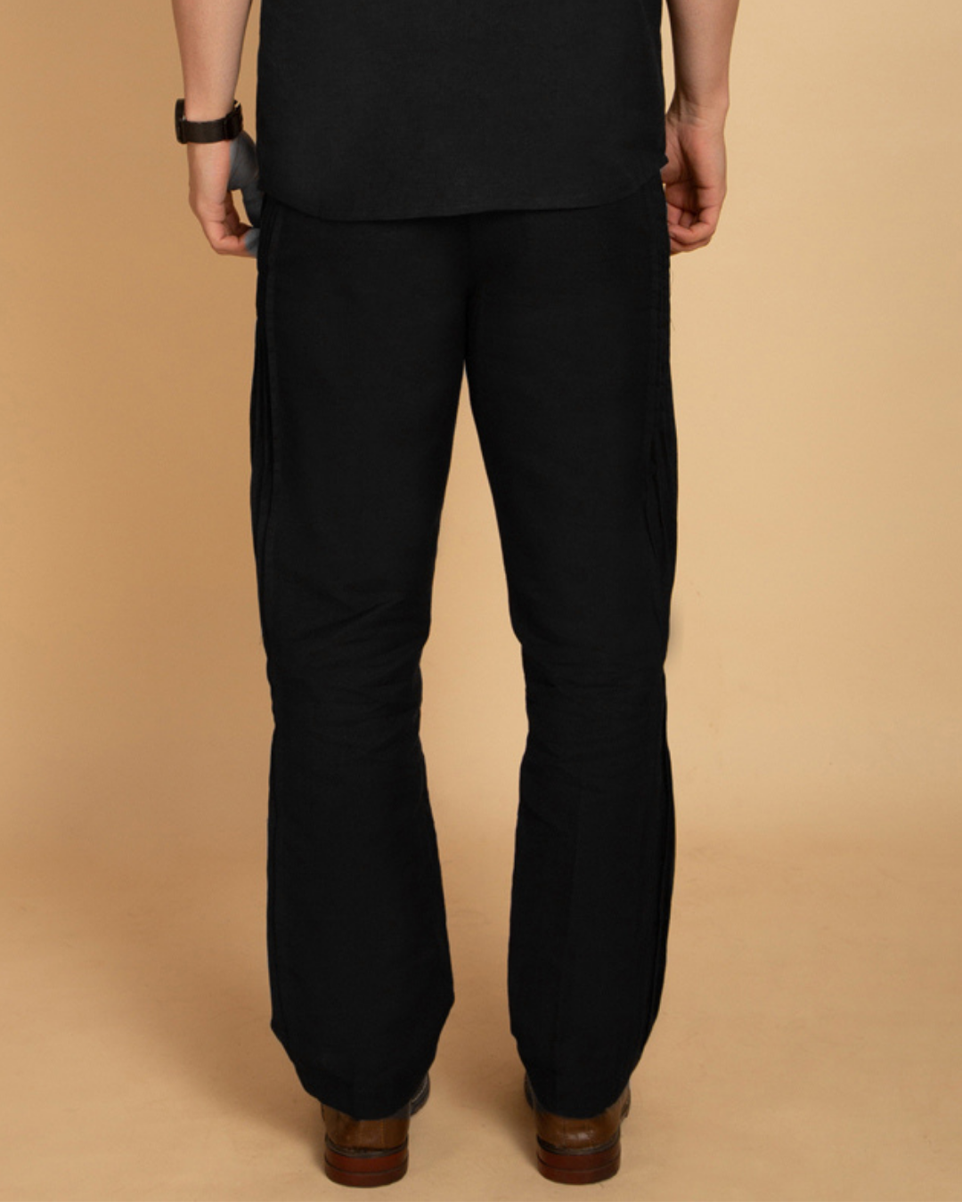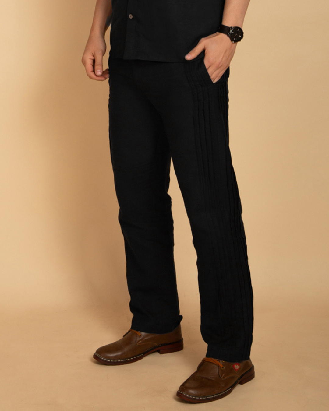 These Men's Black Pintuck Tailored Pants combine timeless style with modern comfort. Featuring pintuck details for added structure and a sharp, tailored fit, these pants provide a clean, sophisticated look. Made from a high-quality black hemp-cotton blend fabric, they offer durability, breathability, and a soft feel for all-day comfort. Perfect for both formal settings and casual outings, these versatile pants can be paired with a dress shirt for the office or a sweater for a more relaxed look. A must-have for any man who values both style and sustainability in his wardrobe.
