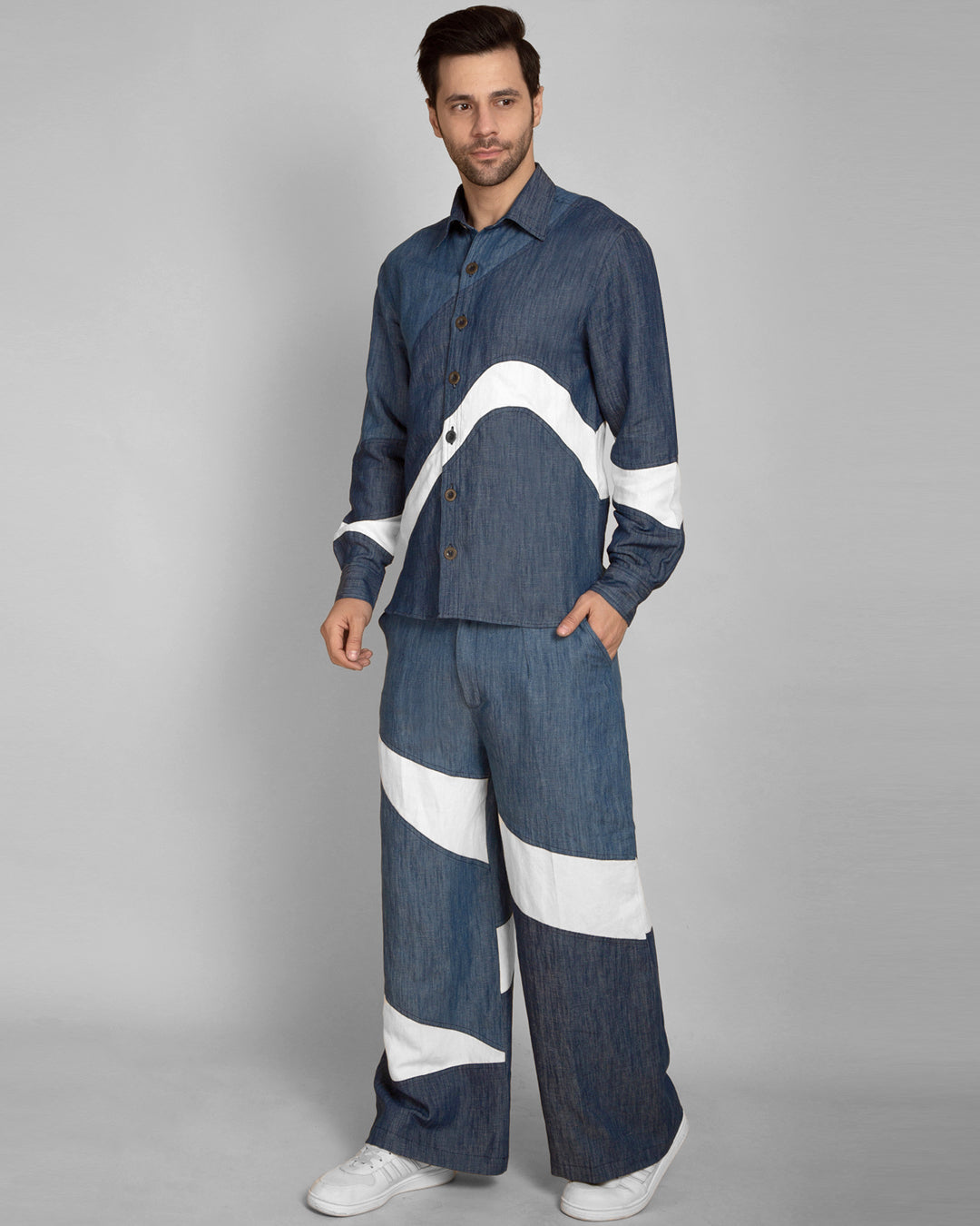 Complete your look with these Men's Denim Patchwork Baggy Fit Trousers from our three-color co-ord set. Featuring a baggy fit, these pants offer both comfort and a relaxed style. With slit pockets, a contrast flap, and belt loops, these trousers add practicality and unique detail to the design. The denim patchwork in three colors creates a striking, modern aesthetic that pairs perfectly with the matching shirt. Whether for a laid-back day or a casual evening out, these trousers offer a fashionable and functional choice for the style-conscious man.