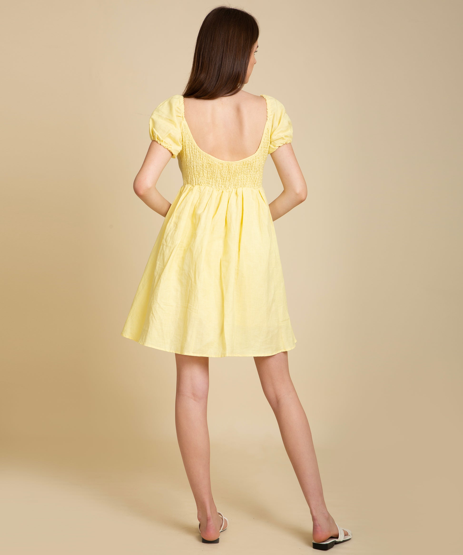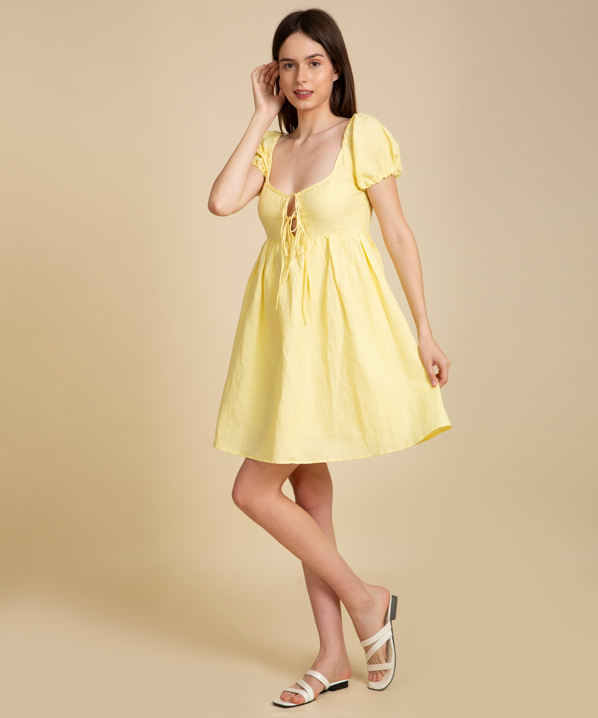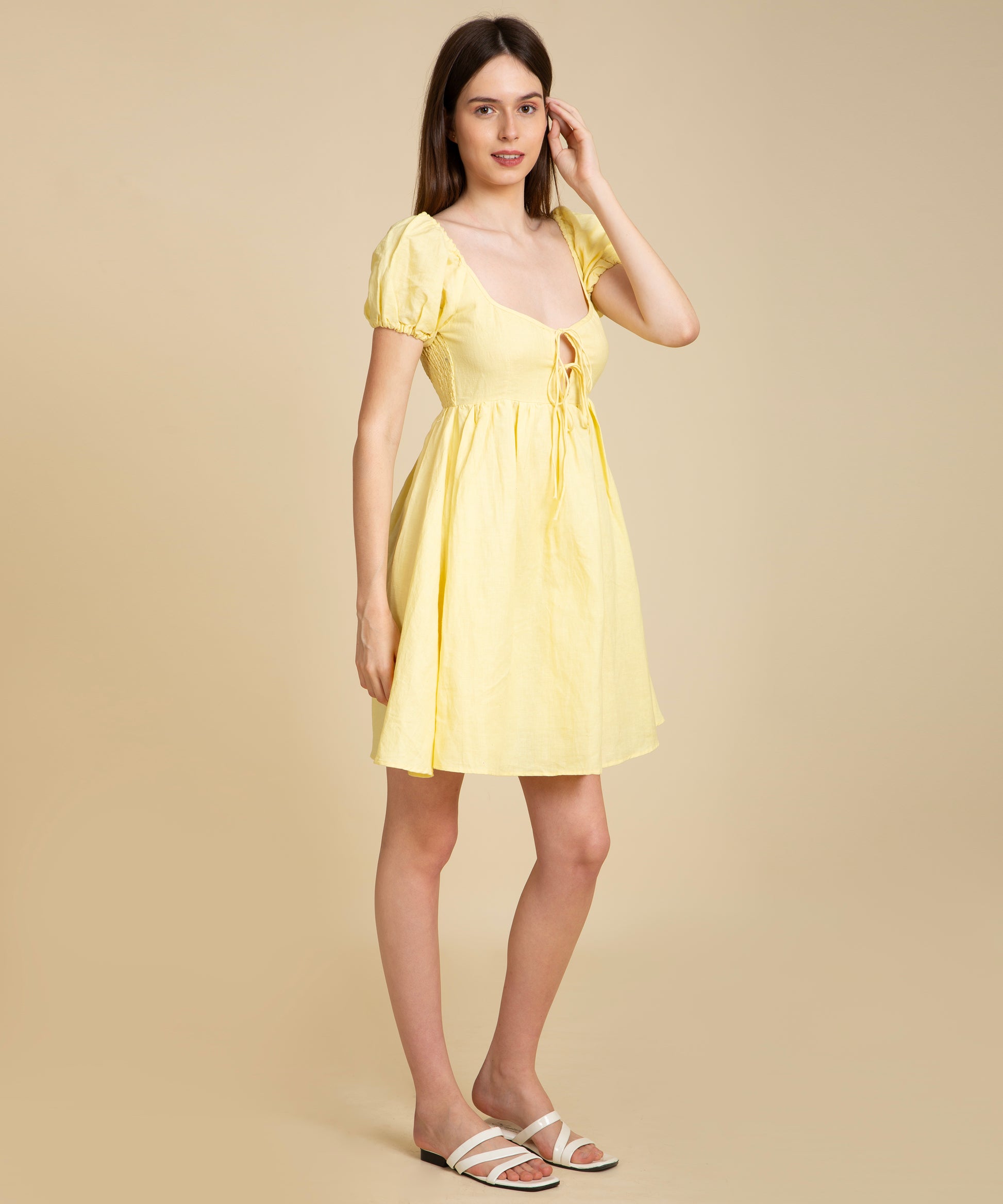A cheerful yellow mini dress featuring puff sleeves, smocked back, and a cute front tie detail for playful summer vibes.