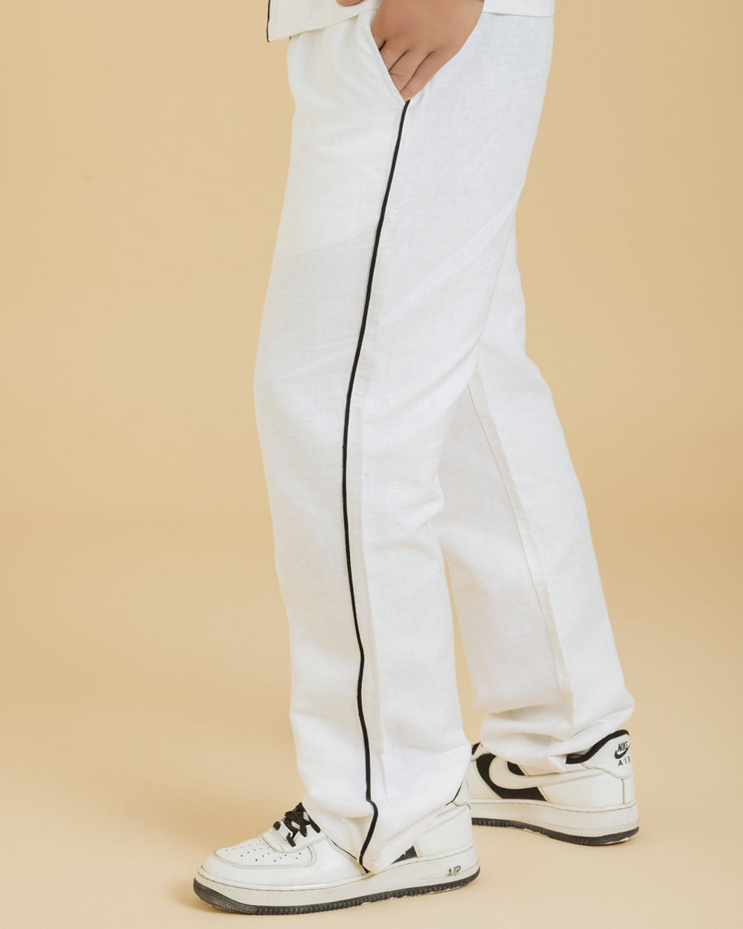 These white full-length men's pants combine classic tailoring with a modern twist, perfect for both smart-casual and semi-formal occasions. Crafted from soft, breathable fabric, the pants feature sleek black piping along the side seams, adding a sophisticated contrast to the clean white design. The tailored fit ensures comfort without compromising on style, making these pants a versatile choice for any event.