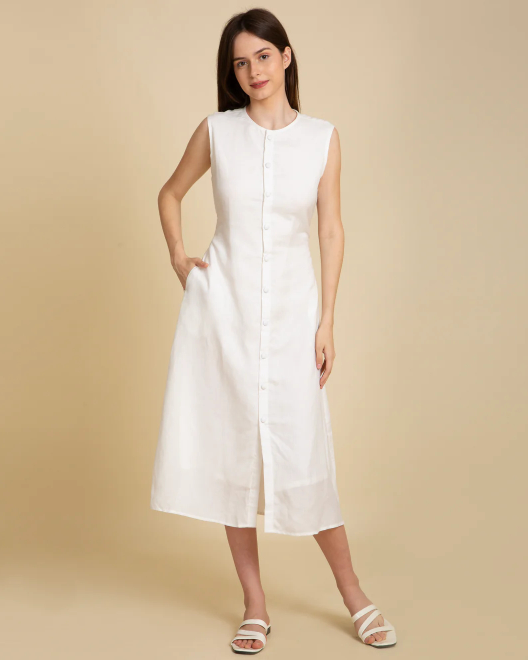 An effortlessly elegant sleeveless white dress crafted from a soft hemp-Tencel blend. Features a front button-down design, flattering waist tie, and side pockets — perfect for everyday ease and timeless style.