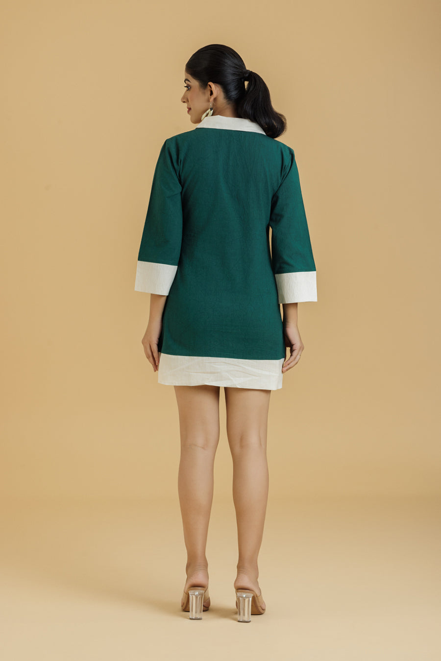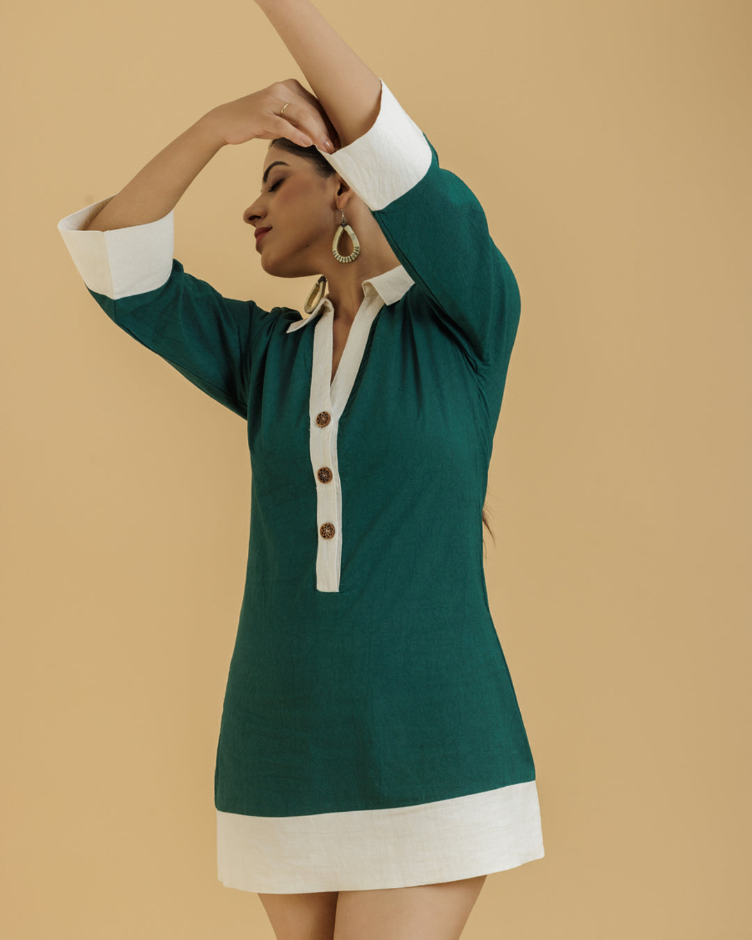 Introducing our Women's Loose Fit Bell Sleeves Dress, a perfect blend of relaxed style and sophisticated design. This dress features a V-neck collar and loose-fitting bell sleeves, offering both comfort and elegance. The use of two contrasting colors adds a dynamic touch, while the large wooden buttons on the front placket provide a stylish and unique detail that enhances the overall look.
