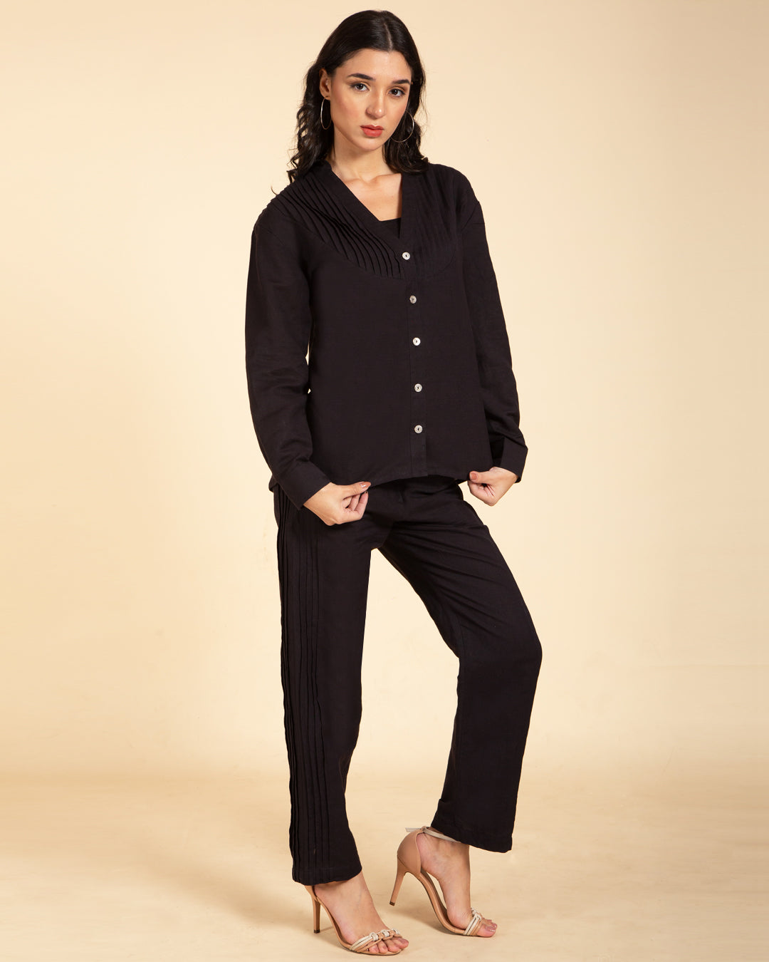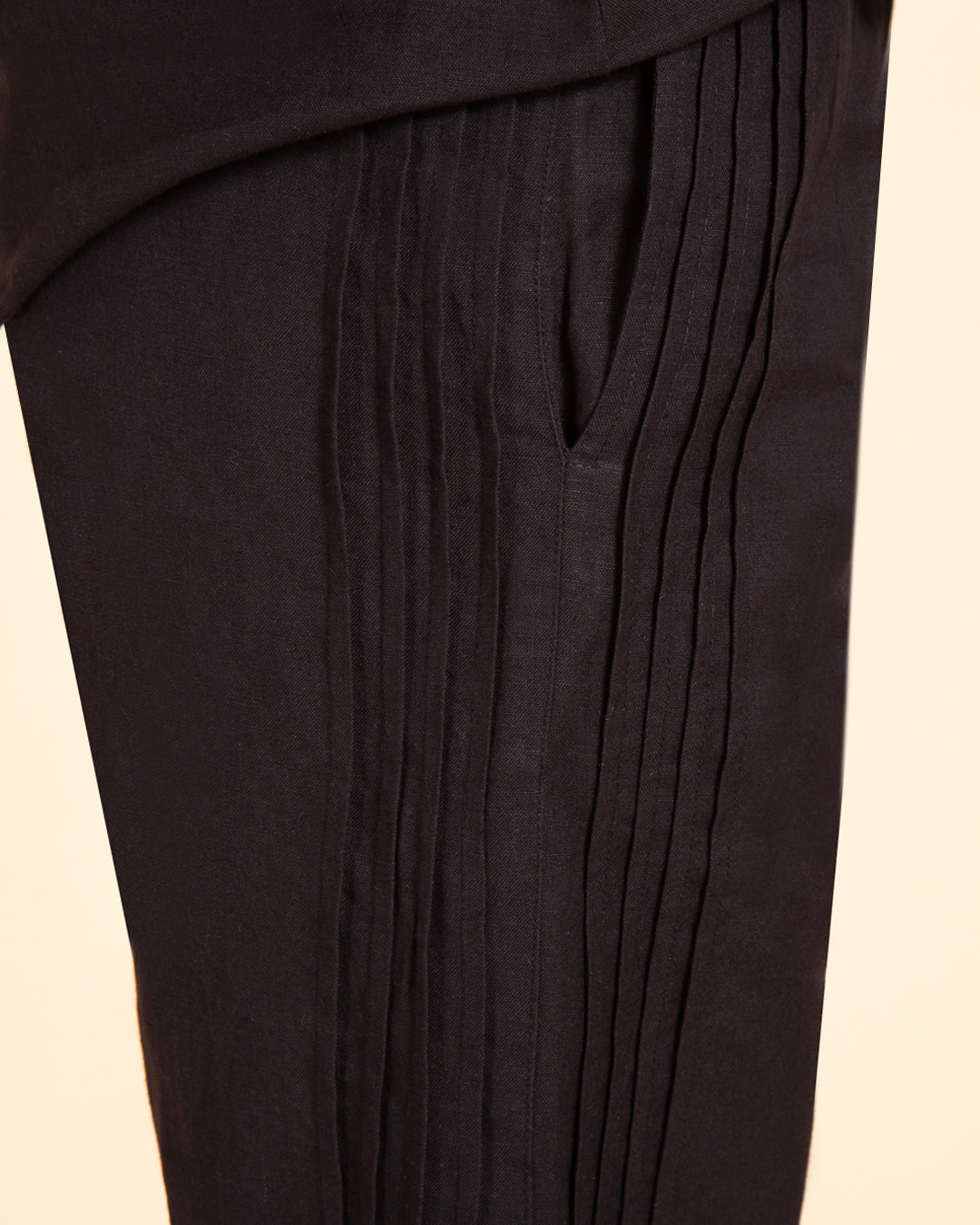 These Women's Black Pintuck Tailored Pants offer a sleek and polished look, perfect for both professional and elegant occasions. Designed with pintuck detailing for added structure, they provide a tailored, flattering fit. Made from a black hemp-cotton blend fabric, these pants are soft, breathable, and environmentally conscious, offering the perfect combination of comfort and style. Whether paired with a blouse for work or dressed up for an evening out, these versatile pants bring sophistication and refinement to any wardrobe. A must-have for the modern woman seeking both style and sustainability.