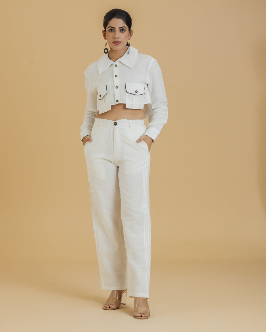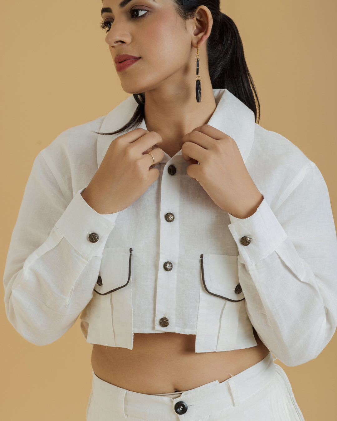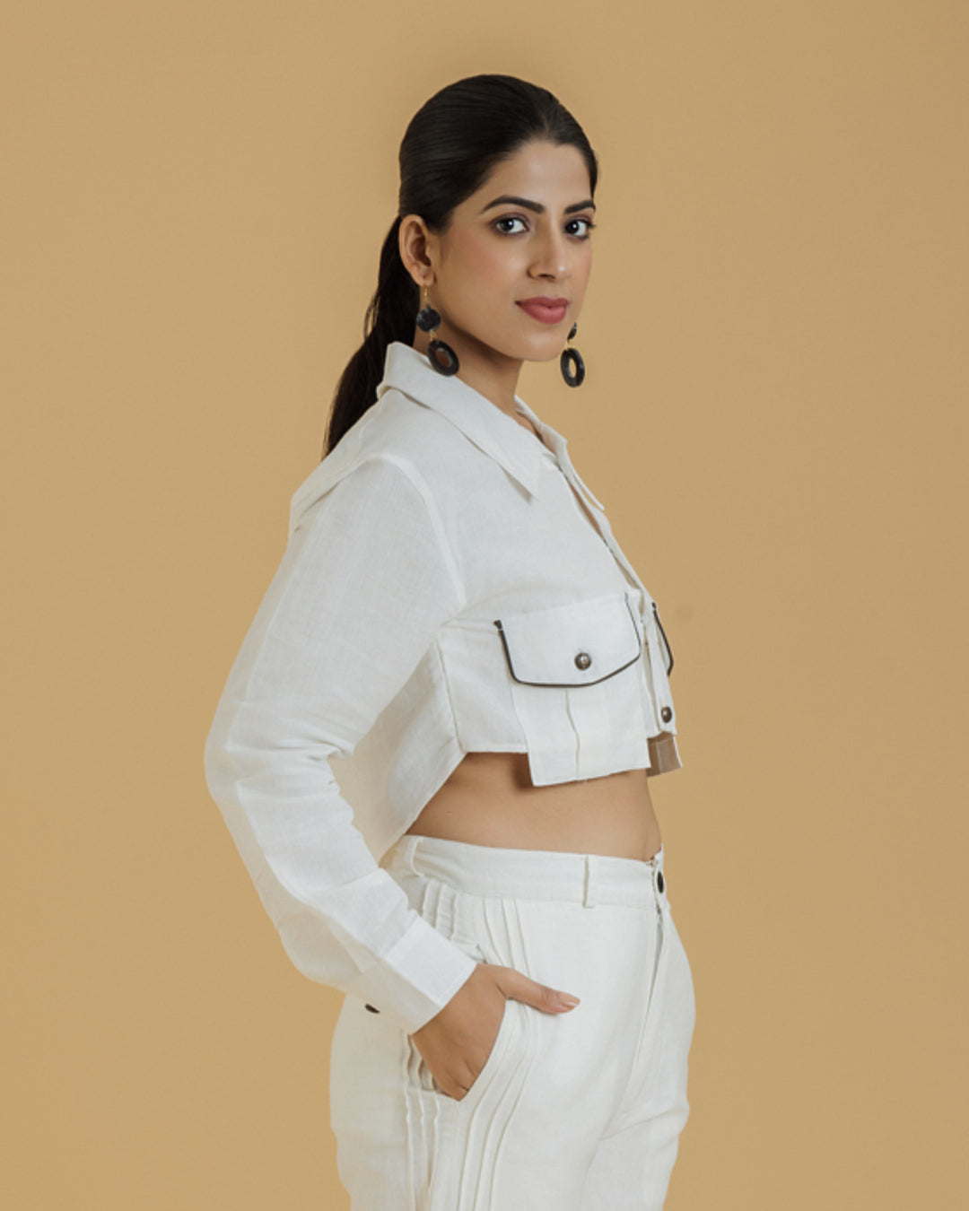 Introducing our Women's Crop Shirt, a blend of classic style and modern detailing. This shirt features distinctive patch pockets on the front, each enhanced with piping detailing on the flaps. The unique Peter Pan collar adds a touch of vintage charm, making this crop shirt a standout piece in your wardrobe.